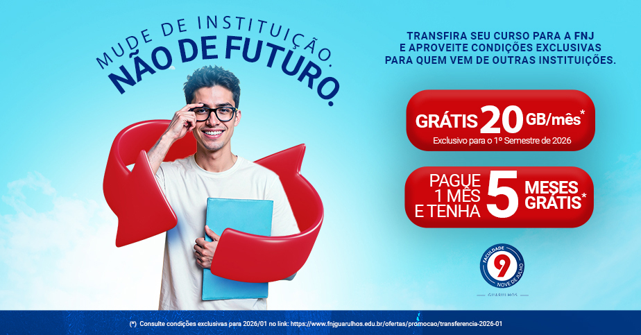 Informações Adicionais: (i) para transferência o curso de origem deve ter aderência ao curso pretendido, reservando-se a FNJ o direito de definir as adaptações curriculares que se fizerem necessárias; (ii) quando da transferência, será avaliada a compatibilidade entre a última série concluída e a série na qual o estudante dará continuidade no curso; (iii) a oferta de isenção das mensalidades de fevereiro, março, abril, maio e junho de 2026 se dá mediante o pagamento da matrícula no ato da contratação e no período estabelecido no presente regulamento; (iv) a formalização da matrícula está condicionada ao pagamento da primeira parcela no ato da contratação e está sujeita à formação de turma e à confirmação de vaga no curso, período e campus escolhidos; (v) o valor de mensalidade indicada no site de transferência correspondem ao 1º semestre letivo (civil) de 2026 e está com Desconto Extraordinário correspondente a condição especial e exclusiva para o 1º semestre letivo (civil) de 2026; (vi) o Desconto Extraordinário, que constitui liberalidade da FNJ, é exclusivo para as parcelas do 1º semestre letivo (civil) de 2026; (vii) sobre o valor de cada parcela não incidirá qualquer outro desconto eventualmente concedido pela FNJ em decorrência de parcerias; (viii) o aluno, no ato da matrícula, tomará conhecimento do valor efetivamente contratado, correspondente ao valor integral de cada parcela que compõe o semestre, sendo que o valor promocional e extraordinário objeto da presente oferta é exclusivo para o 1º semestre letivo (civil) de 2026.
